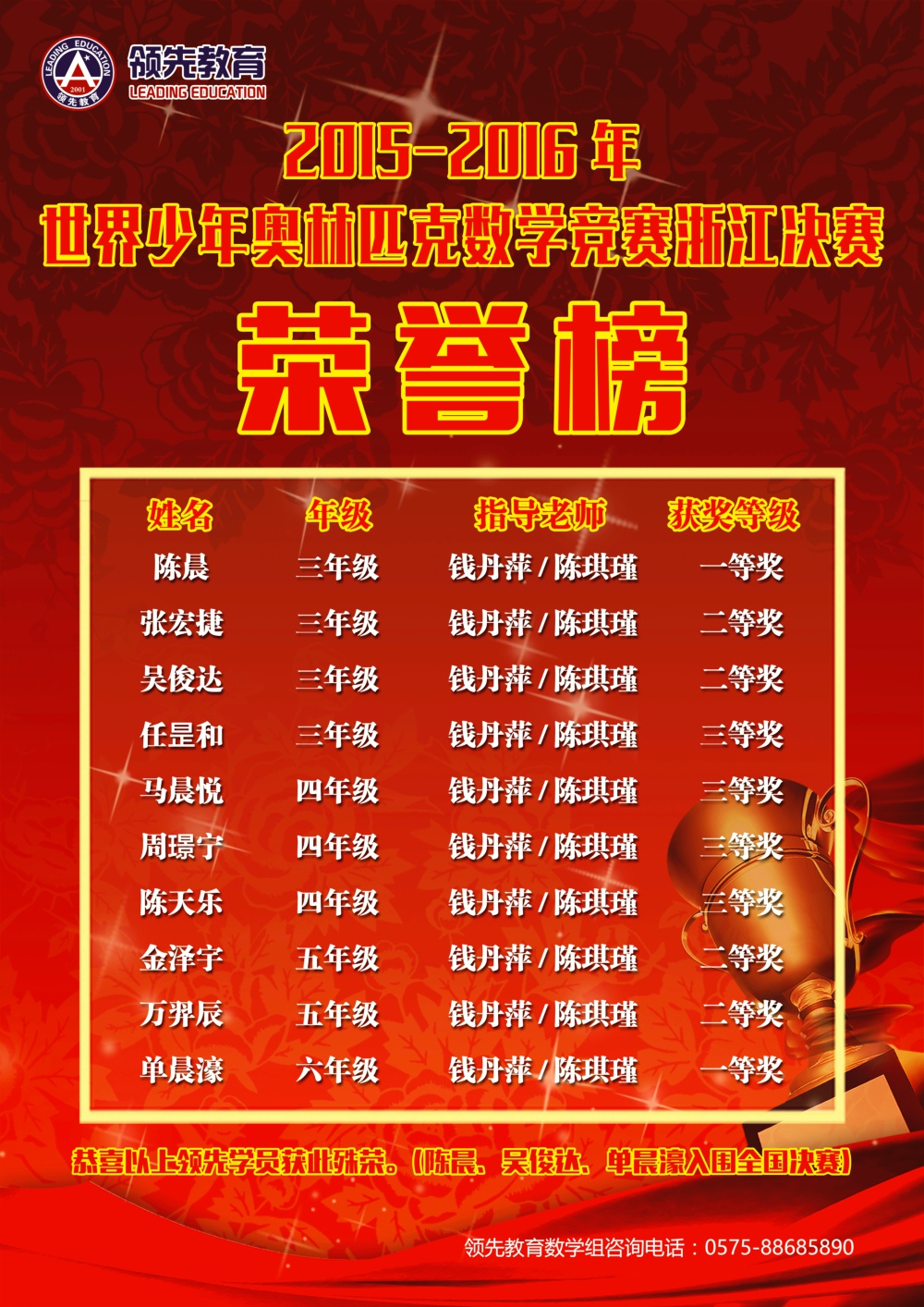 2015-16世界少年奥林匹克数学浙江决赛荣誉榜