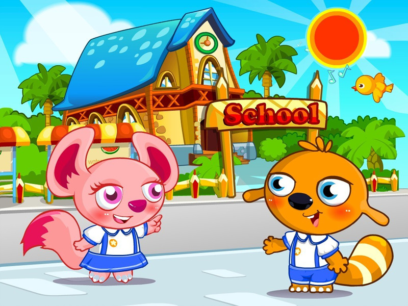 sun bird road school house tree clock window animal pupil happy laugh cloud red blue green brown pink yellow dress